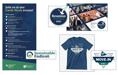 Identity graphics can help create a visual brand for annual events and programs on campus. These secondary graphics should only be used in conjunction with the primary logo and should never replace an official Endicott logo or identity. Graphics must be designed by CCM and their use approved by CCM.