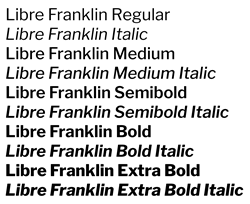 Libre Franklin is available to use in a variety of weights, as shown above. It can be downloaded from Google Fonts.