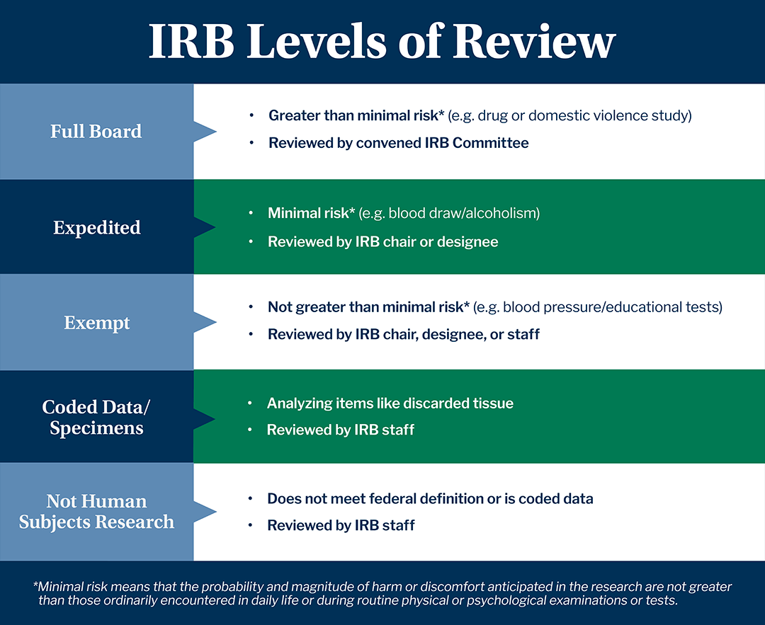 Applications that involve more than minimal risk or those in which the identity of participants is at risk require a full IRB review.