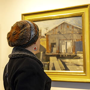 Endicott College Dean of Visual & Performing Arts, Mark Towner says, “I particularly like the quiet spaces in and around the buildings and the streets that allow my mind to generate stories, histories, even mythologies about the rich histories inherent in this fishing community. Ambiance and emotional texture complement the qualitative depth of paint and brushstroke.”