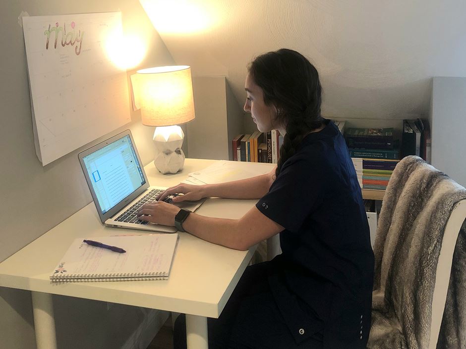 Shimansky has created a comfortable work-from-home space for herself, so that she can stay focused and organized, while taking courses online. She explains that our nursing educators have changed the way homework is assigned and tests are administered, effectively adjusting the learning environment to better suit the needs of its students. She notes that “they record all the lectures and post them later so that we can listen to them again at any time. This is helpful because I can watch the lectures when I feel I’m ready to absorb the information.”