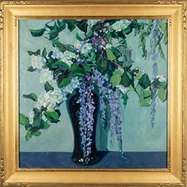 Manninen Center one painting Lilacs & Hydrangeas. Oil on canvas. 32” x 32”. 1928.