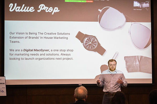 Ryan Curley ’22 presented Launch Partners, an advertising and marketing startup that he operates with partner Nik Kasprzak ’23, who was traveling with the men’s volleyball team to the NCAA semifinals. The duo billed their business as a “digital MacGyver,” a one-stop-shop for marketing needs and solutions—but they want to grow the team, expand services into motion graphics and video production, and need money to make that happen.