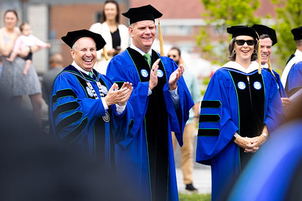 At Endicott’s 82nd Commencement, U.S. Secretary of State Marty Walsh (center) joined President Steven R. DiSalvo and Chair of the Board of Trustees Melissa Hempstead '69 to cheer on the Class of 2022 procession. Walsh also received an honorary doctor of law, honoris causa, and served as the day’s Commencement speaker. No matter how tumultuous the world may be, Walsh told the Class of 2022, “don’t let the uncertainty of this moment limit you. Don’t lower your expectations. And whenever you do, don’t shrink your dreams. In fact, aim bigger than ever. The future is now yours to create. And we are depending on you.”