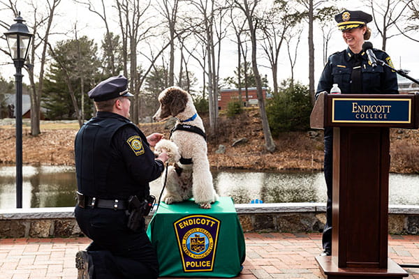The Endicott community turned out to witness its newest Gull, a comfort dog named Gary, get sworn in as a working member of the Endicott College Public Safety & Police Department. In this photo, caretaker Officer Elliot Lanciani places an Endicott Police Department badge on Gary. The ceremony was presided over by Chief of Police and Director of Public Safety Kerry Ramsdell.