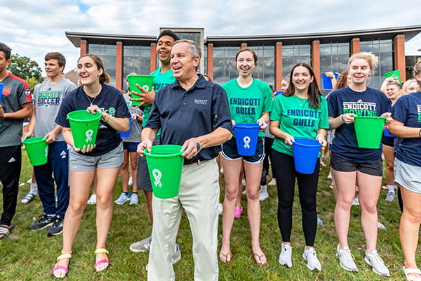 President Steven R. DiSalvo, Ph.D. led the community in the annual Ice Bucket Challenge to raise money for ALS and support the legacy of Beverly native Pete Frates, who was diagnosed with ALS in 2012, and for whom Peter Frates Hall is named. Endicott Trustee and Peter’s mother, Nancy Frates, was present at the event.