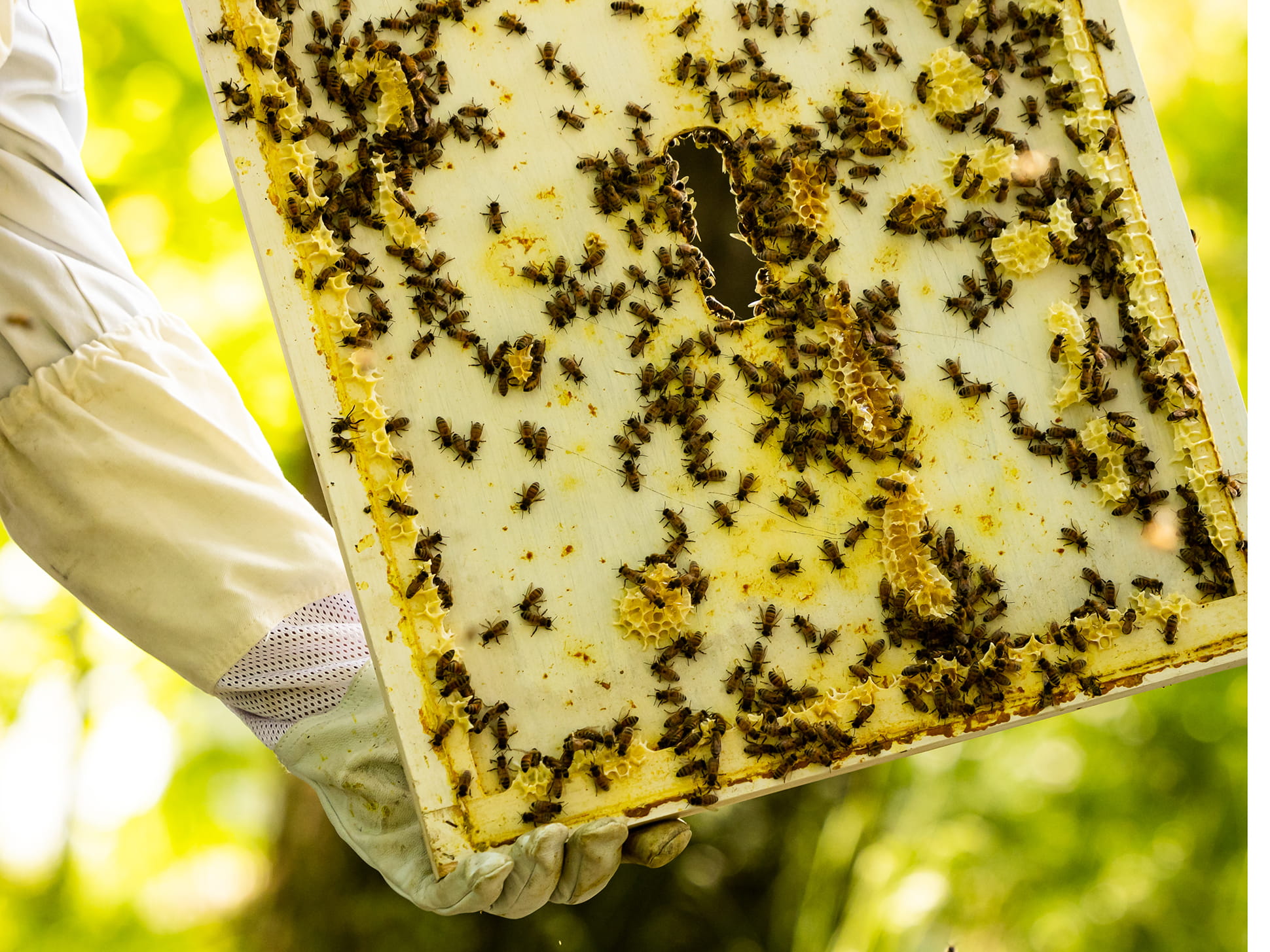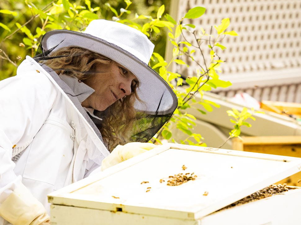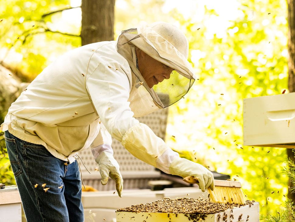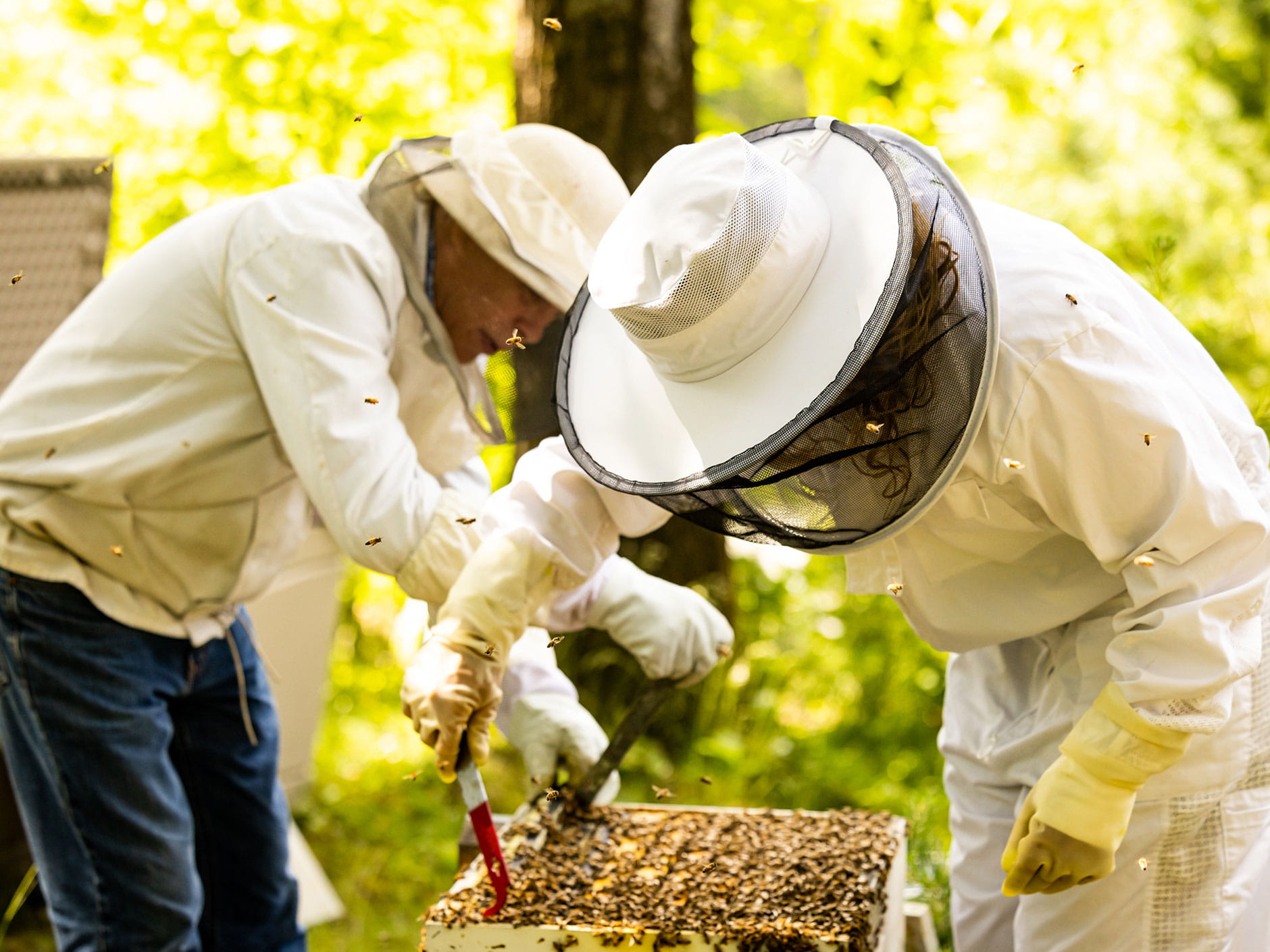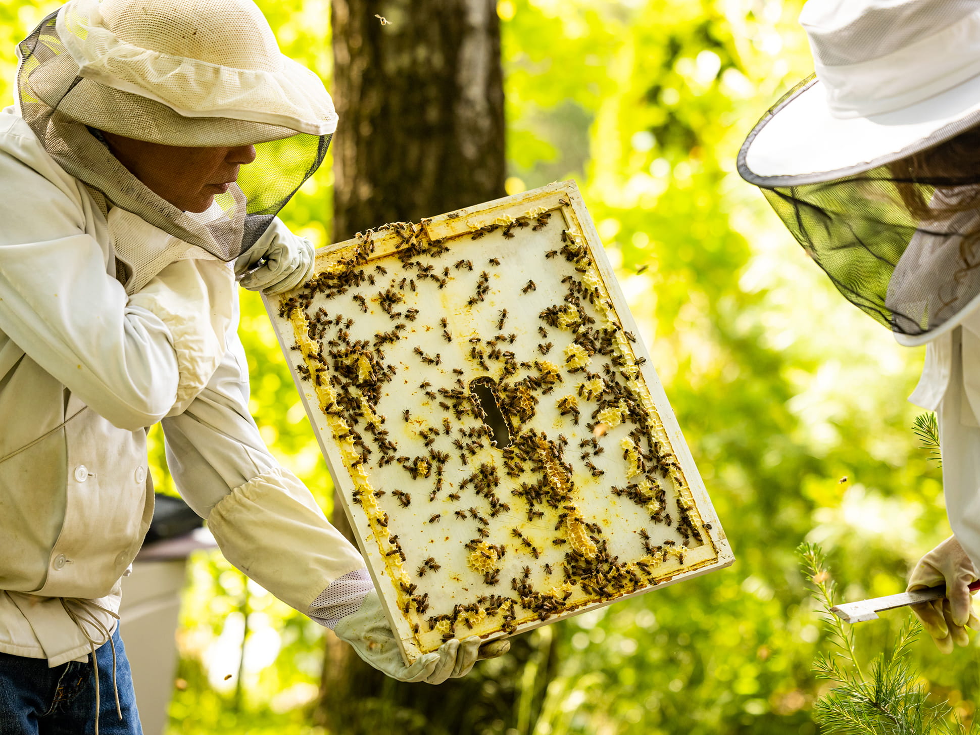 Since its founding by Olivia Mersicano ’22 in 2019, the Endicott Beekeeping Club is still creating a buzz on campus. Despite a few setbacks—one hive didn’t make it through the recent Massachusetts winter—club advisors School of Visual and Performing Arts Dean Mark Towner and Director of Career Services Kate Chroust have installed a new hive, which appears to be thriving. While many of Endicott’s bee hives are established using frames featuring built-in honeycomb foundations, Towner and Chroust forgot some frames during installation and now the bees are forming honeycomb—in staggering shapes—organically. The duo hopes that Endicott honey may soon be on the horizon.