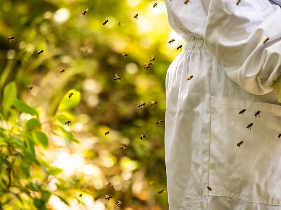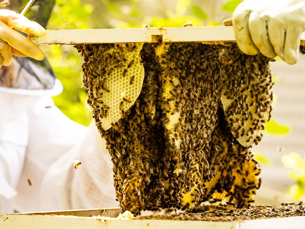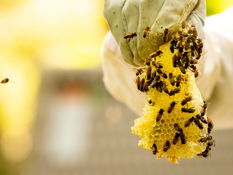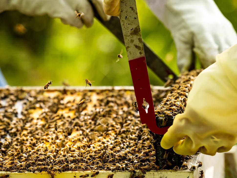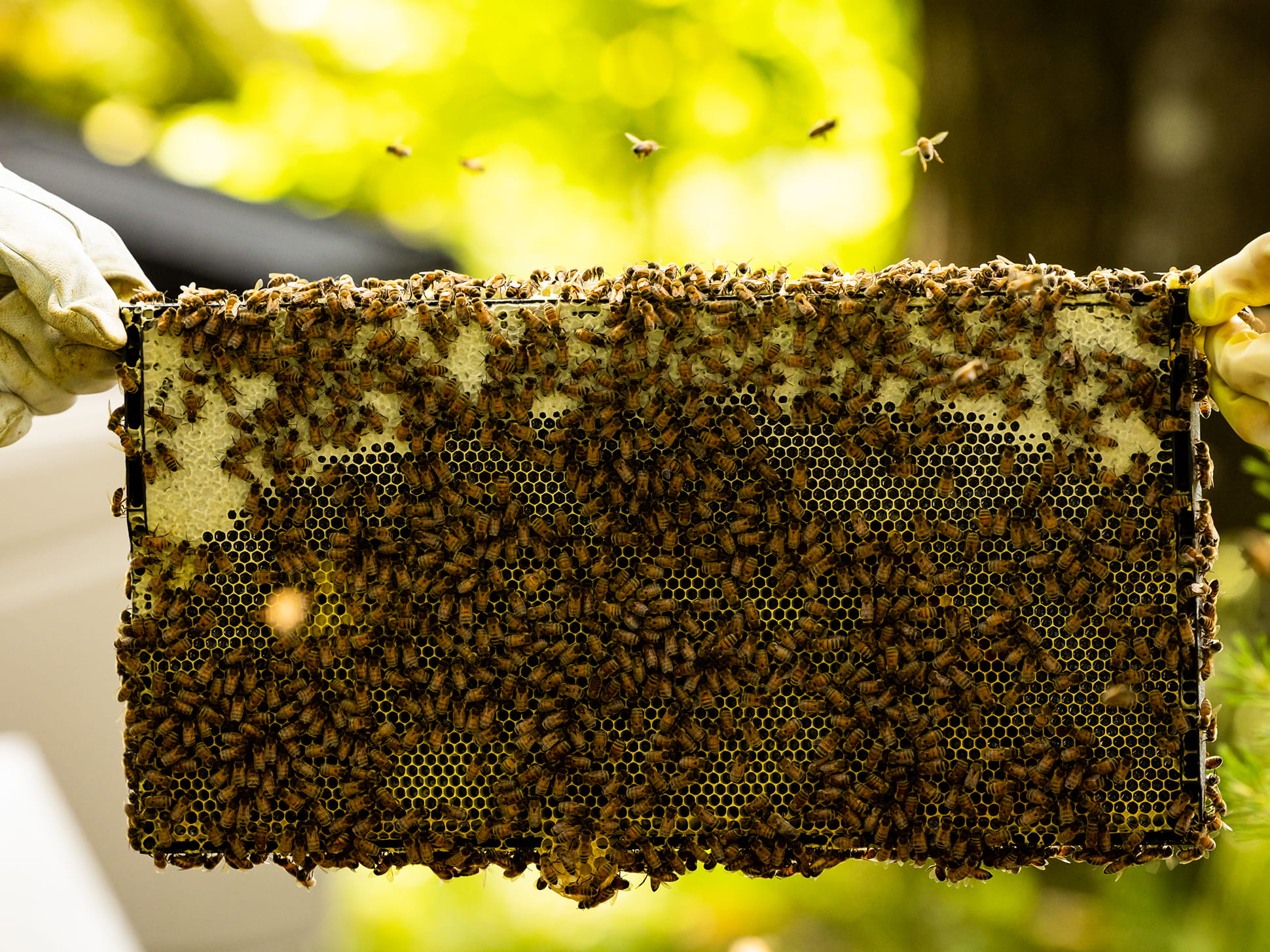 Since its founding by Olivia Mersicano ’22 in 2019, the Endicott Beekeeping Club is still creating a buzz on campus. Despite a few setbacks—one hive didn’t make it through the recent Massachusetts winter—club advisors School of Visual and Performing Arts Dean Mark Towner and Director of Career Services Kate Chroust have installed a new hive, which appears to be thriving. While many of Endicott’s bee hives are established using frames featuring built-in honeycomb foundations, Towner and Chroust forgot some frames during installation and now the bees are forming honeycomb—in staggering shapes—organically. The duo hopes that Endicott honey may soon be on the horizon.