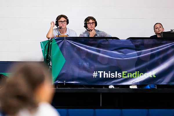 Thanks to a recent internship with Columbia Records, Mason brings entertainment industry experience to his role, and both brothers have internship experience in marketing. Even so, the one element they feel that’s prepared them most for broadcasting is an established closeness with the women’s team. Supporting other teams is a key pillar of Endicott’s athletics program. That, and it’s always been the norm for the men’s team to watch the women play and cheer them on—and vice versa.