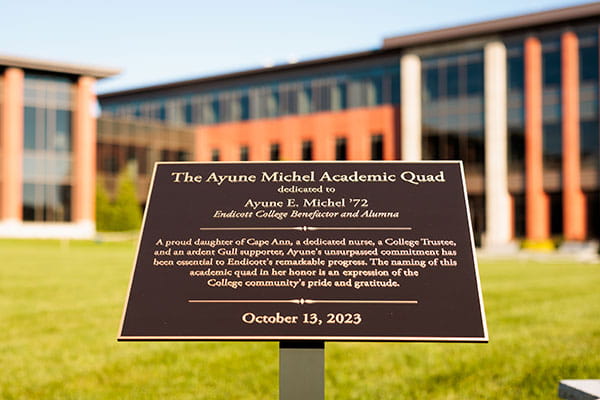 On Friday the 13th, Trustee, Class of 1972 alumna, and nursing director, Ayune Michel, cemented her place on campus with the dedication of the Ayune Michel ’72 Academic Quad, located in front of the newly completed Cummings School of Nursing and Health Sciences. It is a fitting location, as Michel played a major role in funding for the school, thanks to a $2 million gift through Spread Your Wings: The Campaign for Endicott College late last year.