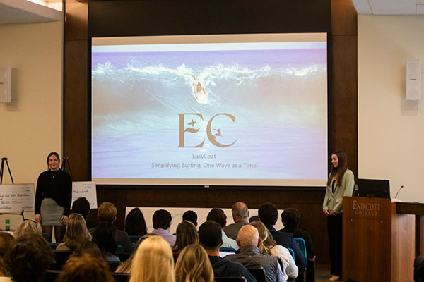 MBA candidate Yuhao Wu presented Happy Pet, a comprehensive app that gives pet owners worry-free pet care; business management major Ridge Ranalletti ’27 pitched EnviroHydro, an electrolyte hydration supplement with zero environmental impact; elementary education major Grace Wlodarczyk ’25 offered a solution to gun violence with Lockdown Lockers, a bulletproof door that slides over classroom doors and locks into place; and biology/biotech major Abbey Agrodnia ’26 and entrepreneurship and marketing major Kristen Precourt ’24, both avid surfers, pitched EasyCoat, a surf wax applicator that’s also a handy scraper.