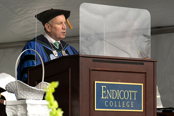 President DiSalvo emphasized the “hard-fought lessons in the power of agility and perseverance” as valuable lessons learned at Endicott, describing them as gifts to the graduates as they join the alumni network.