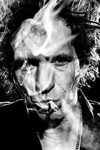 Keith was very cool, the definition of cool. I created a set in the studio that echoed a stage set, all black, hot lights, ashtrays, drinks, light stands, and ashes. And away we went. My cinematic approach and his natural movement with music, smoke, and talk created this very beautiful vibe. This image was created with a macro lens, so I was very, very close. When I saw that smoke ring land on his forehead, I knew this was THE image from the shoot and also, in the world of images, a famous portrait.