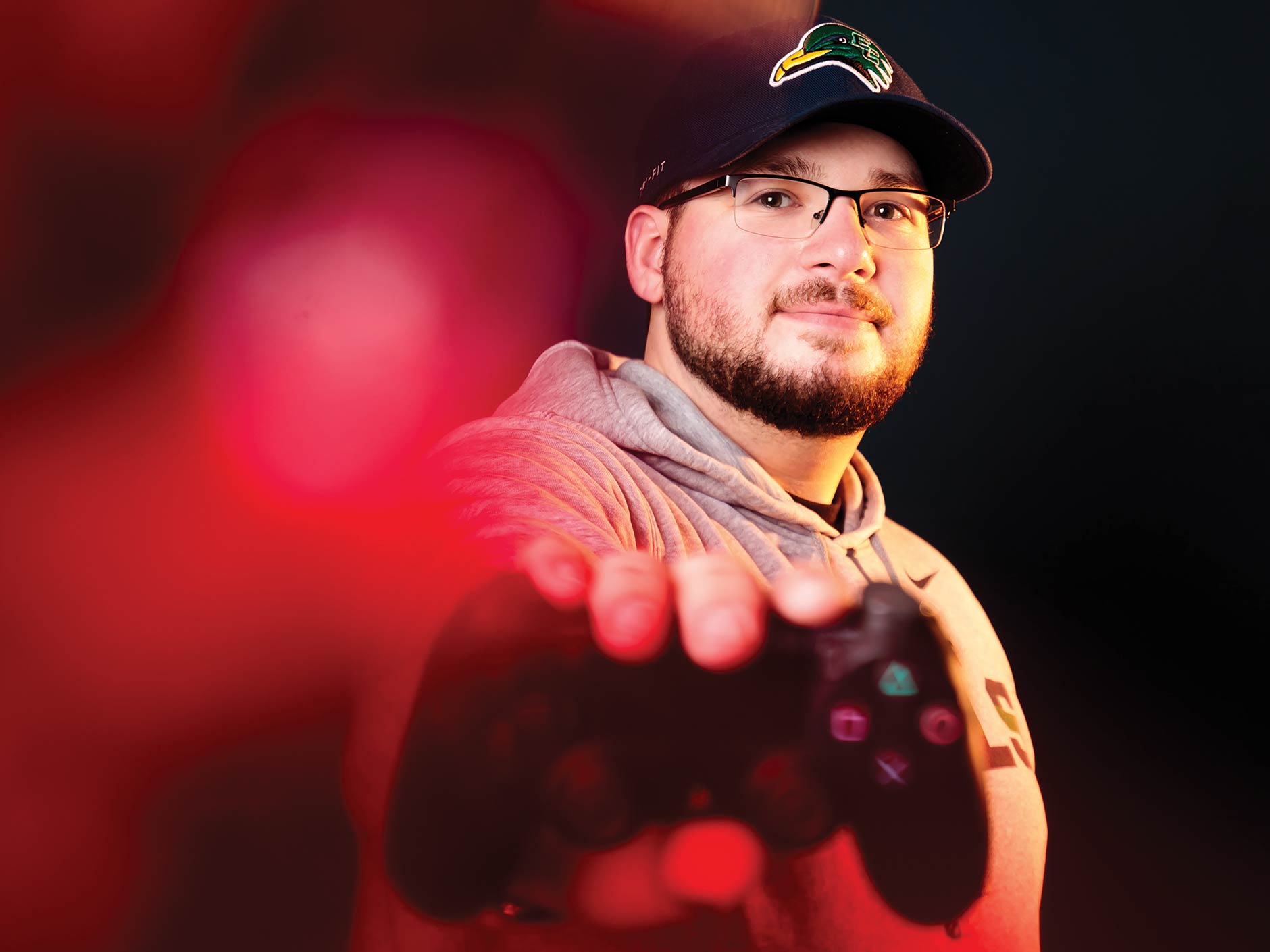 Photo caption (top, main): Seth Rawls ’23 is minoring in esports, a program helmed by Professor of Sport Management Dr. Dina Gentile. Rawls has watched esports skyrocket since he was a kid playing video games.