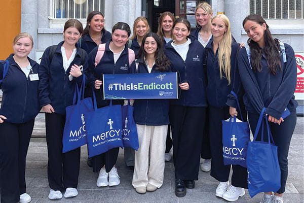 After a mission trip to Guatemala, Mary Miner ’95 found her passion for healthcare, which led her to enroll in Endicott’s nursing program. Now retired, she funds service trips, including a recent clinical rotation for 11 nursing students at Mercy Hospital in Cork, Ireland. “Our students gained valuable insights into healthcare practices in the U.S. and Ireland while developing a deeper appreciation for the cultural dimensions of patient care,” said Dean Amy Smith. “Mercy Hospital is deeply committed to the underserved population in the city, which makes it a very holistic experience for the students.”