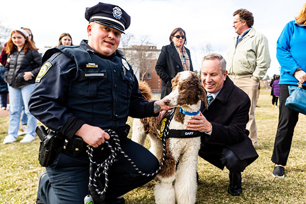 Through the nonprofit Hero Pups, Endicott secured Gary—the first pup to ever serve on the College’s police force. (Hero Pups has also provided therapy animals for Souza’s events in the past.)