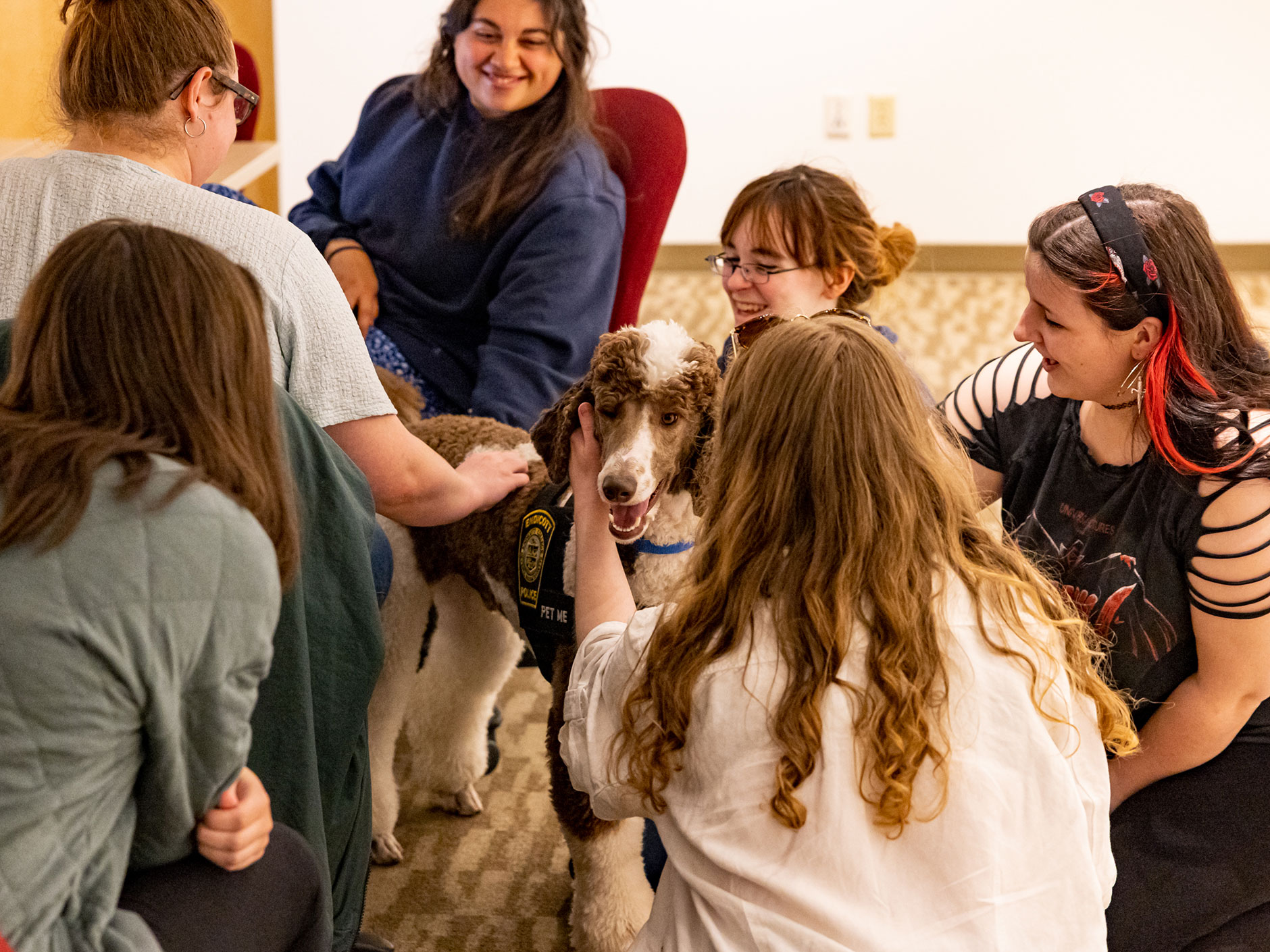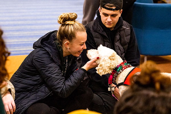 Students greet comfort dogs inside Halle Library
