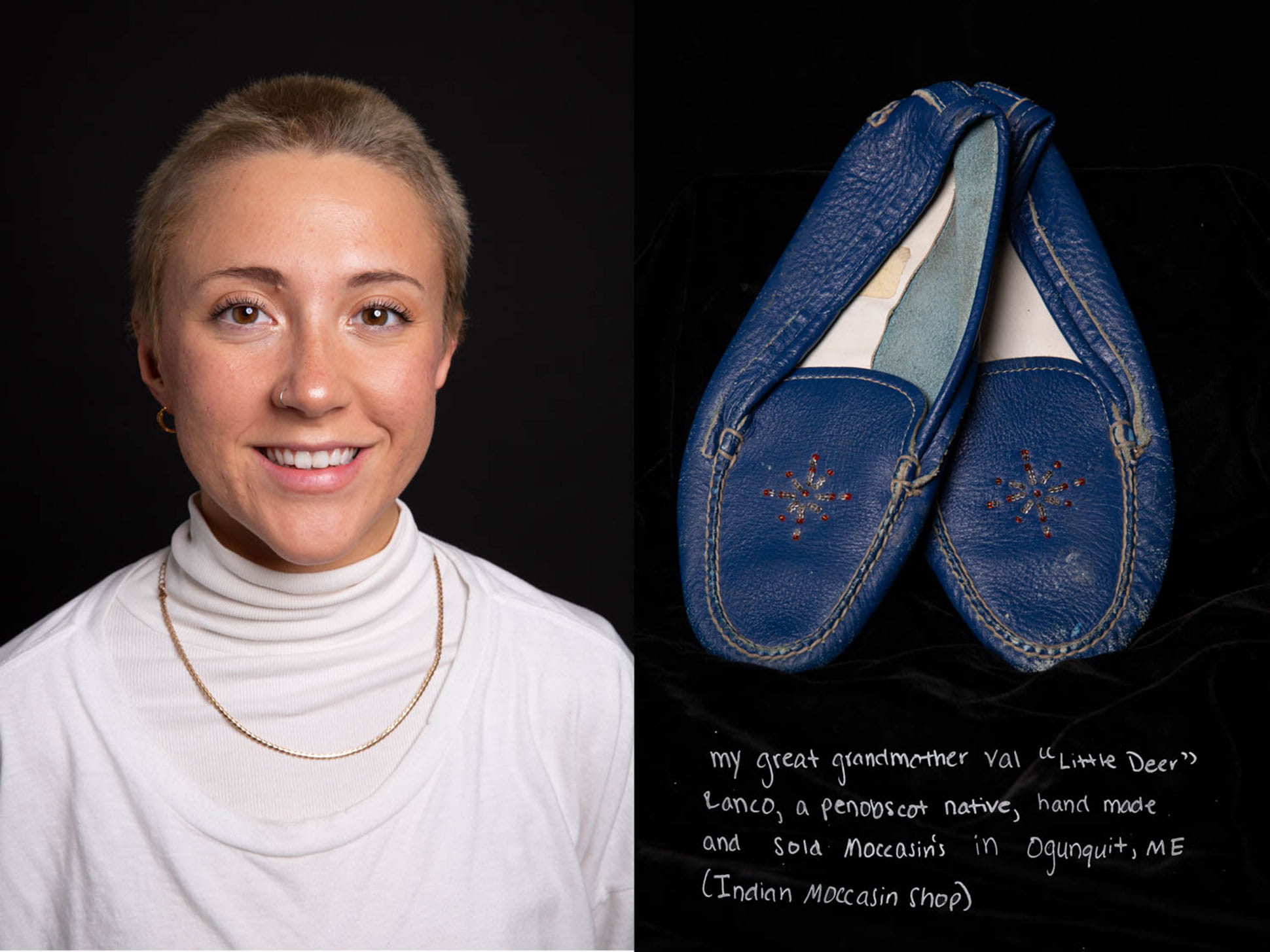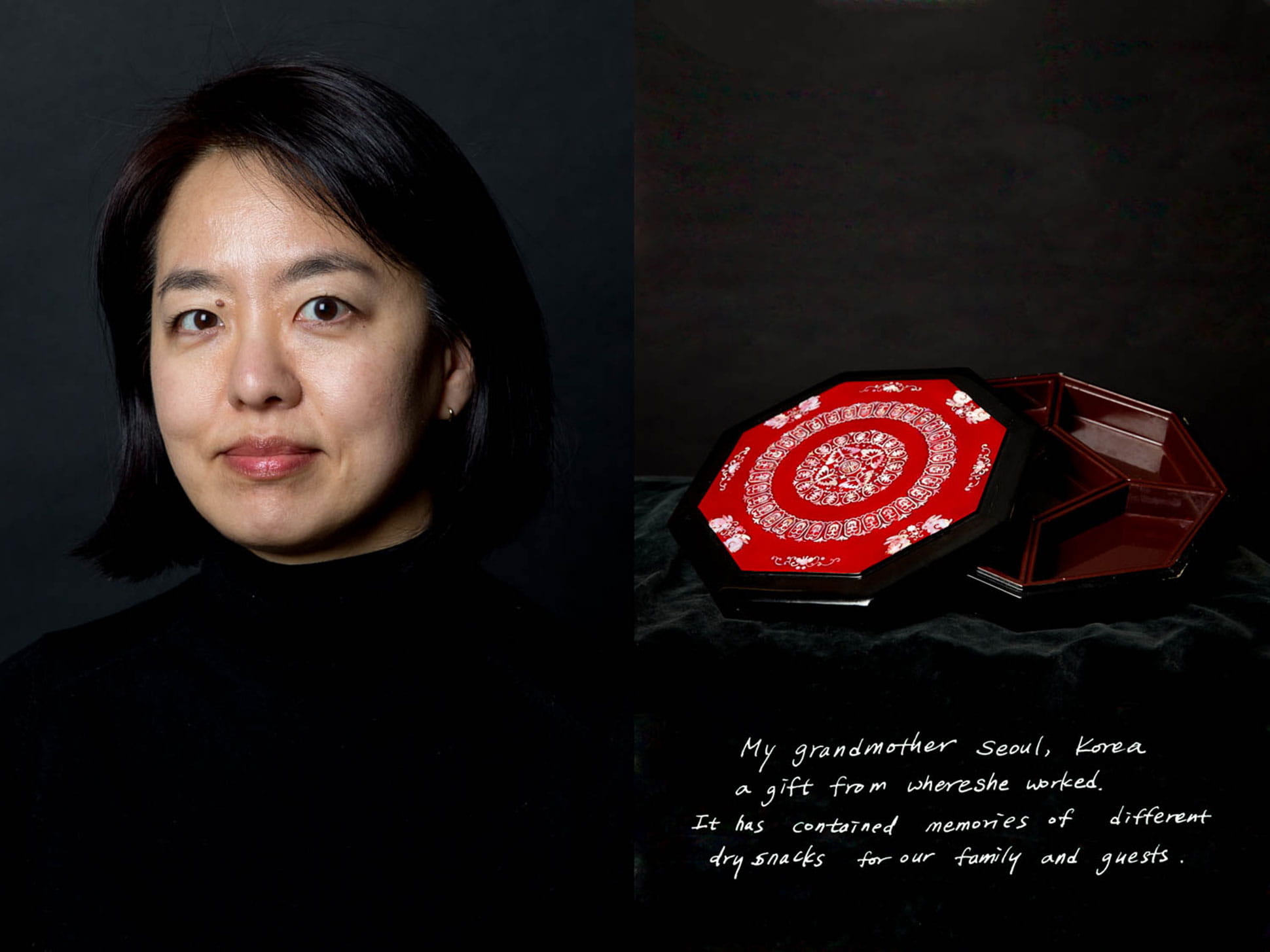 The project is ongoing and gaining traction. So far, Volk has photographed 15 individuals whose portraits appear as a diptych with stark black backdrops. Each individual was snapped with their family treasure and given the chance to write a short caption explaining their ancestry and why the object is important.