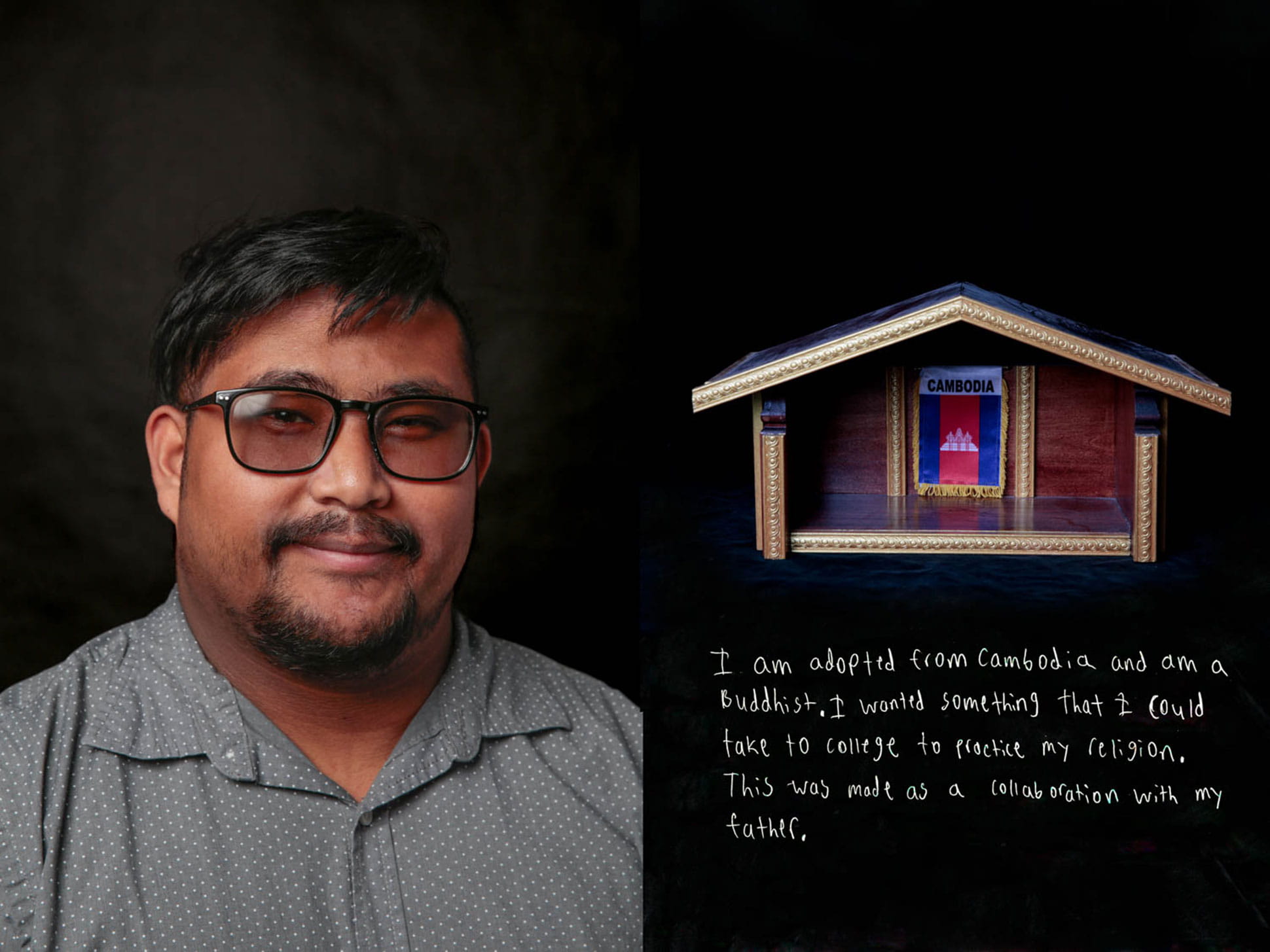 Scholz first heard about the project on a flier at the Center for Belonging, then turned up at one of Volk’s open calls carrying the wooden prayer house he and his adopted dad built together. The house, stocked daily with Buddha offerings, represents Scholz’s recent decision to embrace Buddhism and connect more deeply with his Cambodian ancestry.