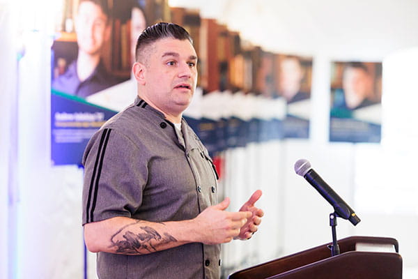 “Now, I think almost every person in this room has been mentored and inspired by this person,” said Blodgett, who then announced that $8,000 of $50,000 had been raised in the Peter Jenner ’97 M’00 ’02 Hospitality Scholarship.